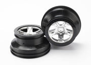 Pair of 5-spoke satin-chrome SCT wheels with black beadlock-style trim feature a dual-profile design with a 2.2" outer diameter and 3.0" inner diameter. Fits 12 mm hex, 4WD front or rear, 2WD rear only.