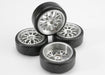 Set of four Pro-Trax medium-compound street tires come mounted with foam inserts and glued to chrome multi-spoke wheels.